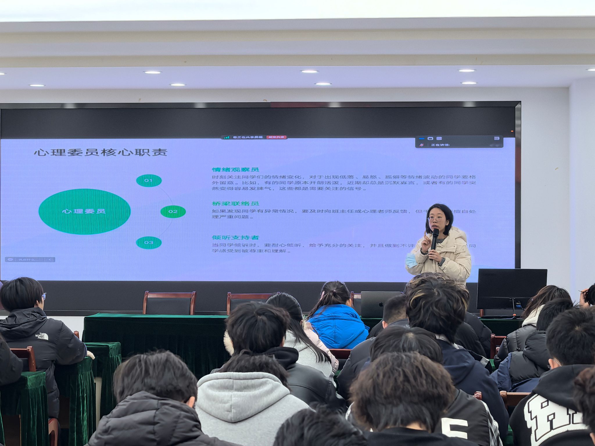 为全面提升班级学生骨干的心理支持与危机识别能力,进一步夯实校园心理健康工作基础,物联网工程学院于12月23日下午组织开展了班级骨干心理助人能力专题培训。本次培训特邀学校心理健康中心钱怡老师担任主讲,采取“线下集中+线上同步”的方式开展,覆盖全院大一至大三年级各班班长、心理委员及其他班委成员,共同学习心理支持知识与实务技能。