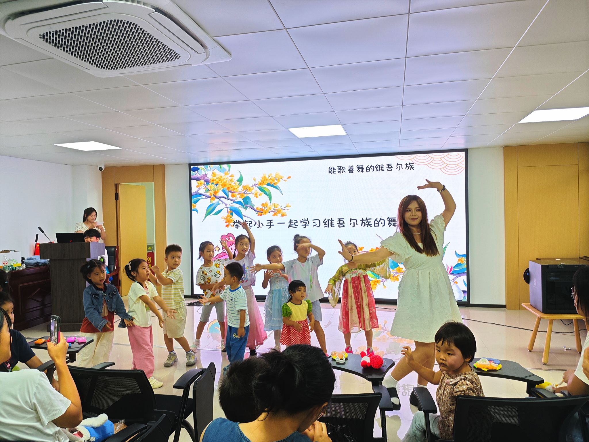 民族风情互动环节将现场气氛推向高潮。新疆同学担任“小老师”,带领大家学习新疆舞蹈的基础动作,如“动脖”“摆手”,家长与孩子们踊跃参与,现场气氛欢乐活泼。在“雅克西课堂”上,孩子们通过趣味比赛学习“亚克西姆赛斯”“热合麦特”等新疆常用语,欢声笑语不断。“团圆传情”游戏中,大家传递祝福、展示才艺,场面温馨而热烈。
