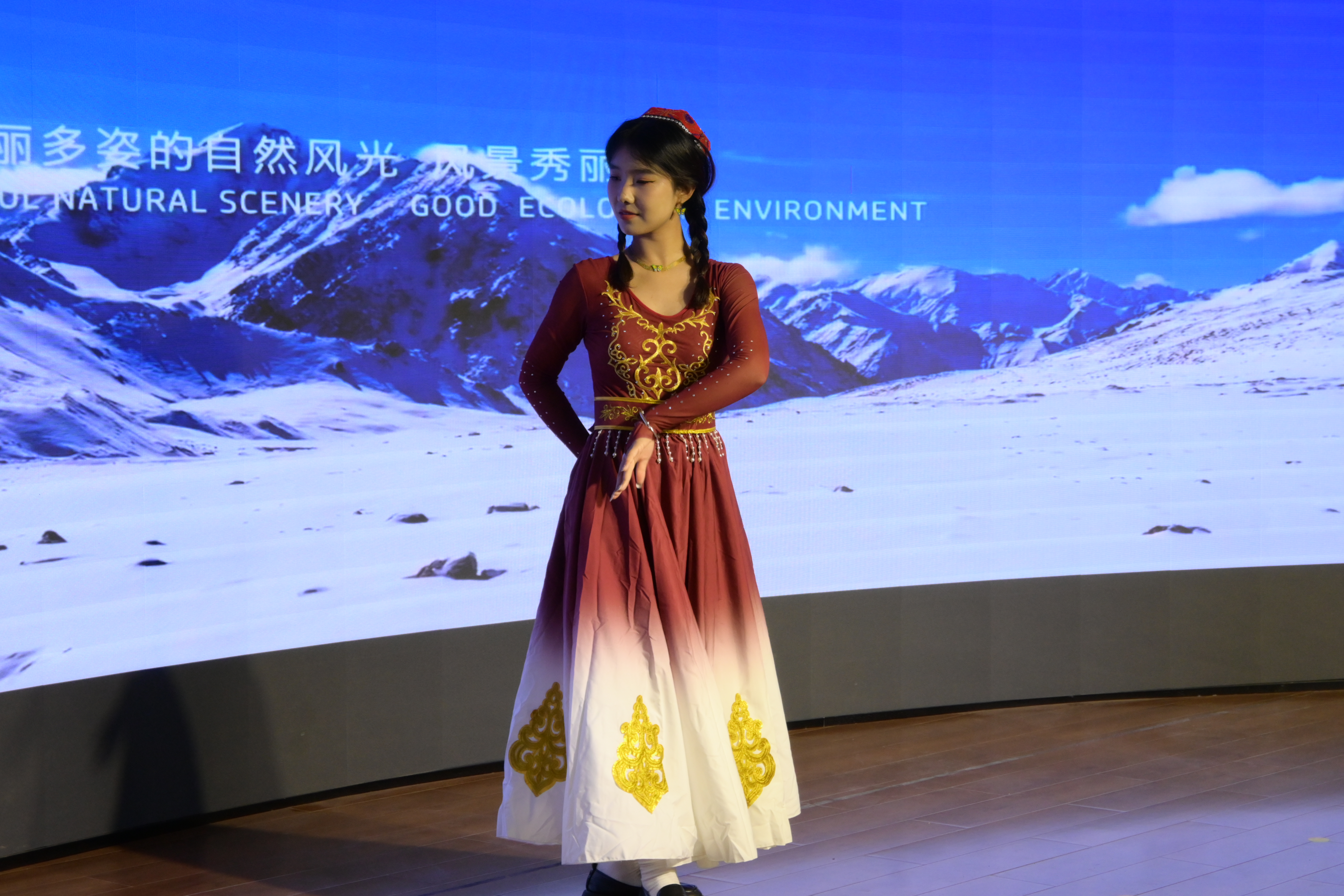 晚会以希尔扎提同学带来的开场舞蹈“跳起来吧”拉开帷幕,身着传统服饰的舞者以激情四溢的舞步,展现了中华民族的活力与热情,瞬间点燃了现场氛围。随后,身着各民族特色服饰的学生们纷纷登台,通过精彩的舞蹈表演展示了各自民族文化的独特魅力。特别是来自双创学院的凯迪日耶同学,她身着西域风格的华丽服饰,在《西域风情》的舞蹈中,将西域文化的独特韵味展现得淋漓尽致,令观众仿佛置身于广袤的草原,感受来自远方的热情与奔放。