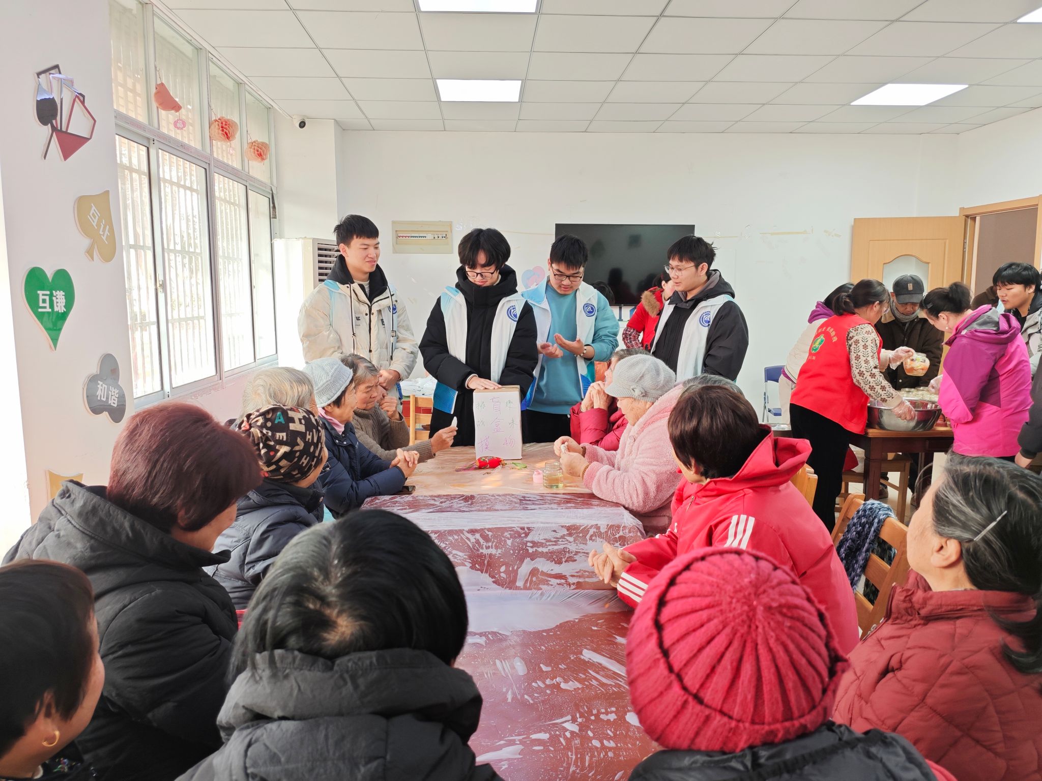 活动伊始,白萝卜、胡萝卜、大白菜等食材以及盐、糖、玻璃缸等物料已有序备置。现场特邀社区中腌制经验丰富的长者进行指导。师生与老人分组协作,共同完成切菜、撒盐、揉搓、装缸等系列工序。志愿者们主动陪伴行动不便的老人与残障人士,协助他们参与制作,让每个人都能亲身感受动手创作的乐趣。在等待腌制的间隙,志愿者们还结合学院专业特色,设计了有趣的互动环节。通过智能软件进行健康知识问答,组织轻松的小游戏,现场笑声不断,其乐融融。