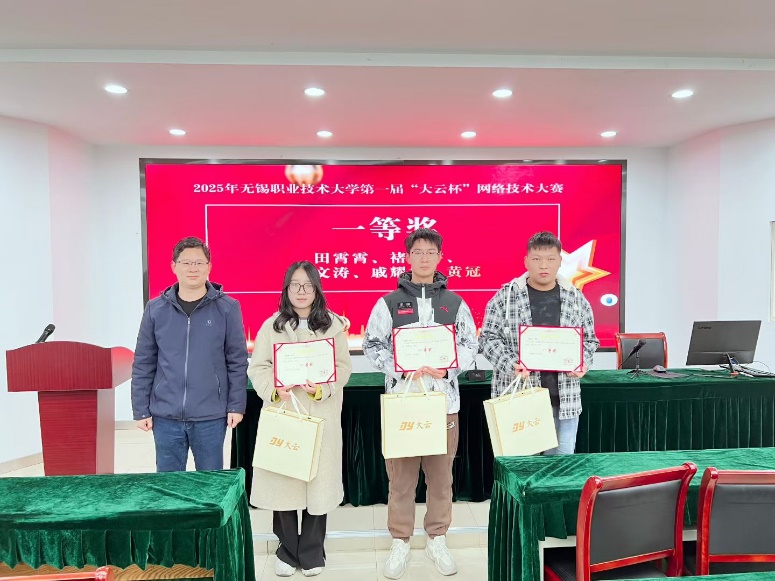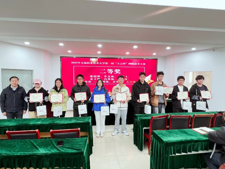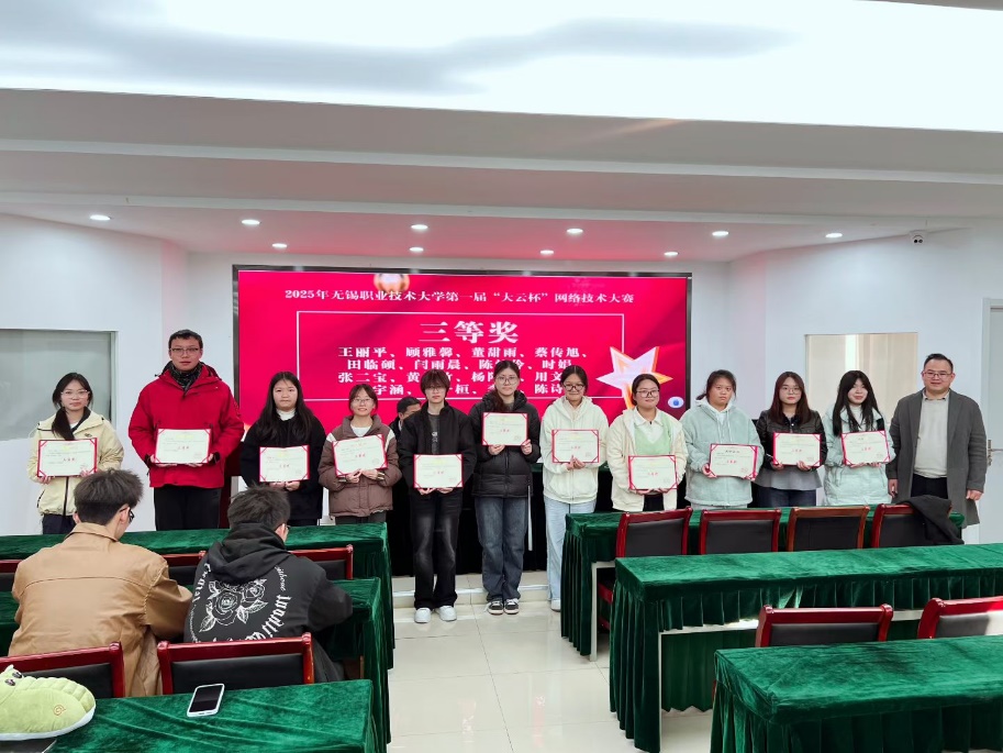 2025年11月25日下午,无锡职业技术大学首届“大云杯”网络技术大赛颁奖典礼在物联网工程学院图C-401室举行。物联网工程学院副院长张文健、无锡大云教育科技有限公司总经理李欢乐、计算机系主任肖颖出席典礼,获奖选手及各班级学生代表共计80余人参加。