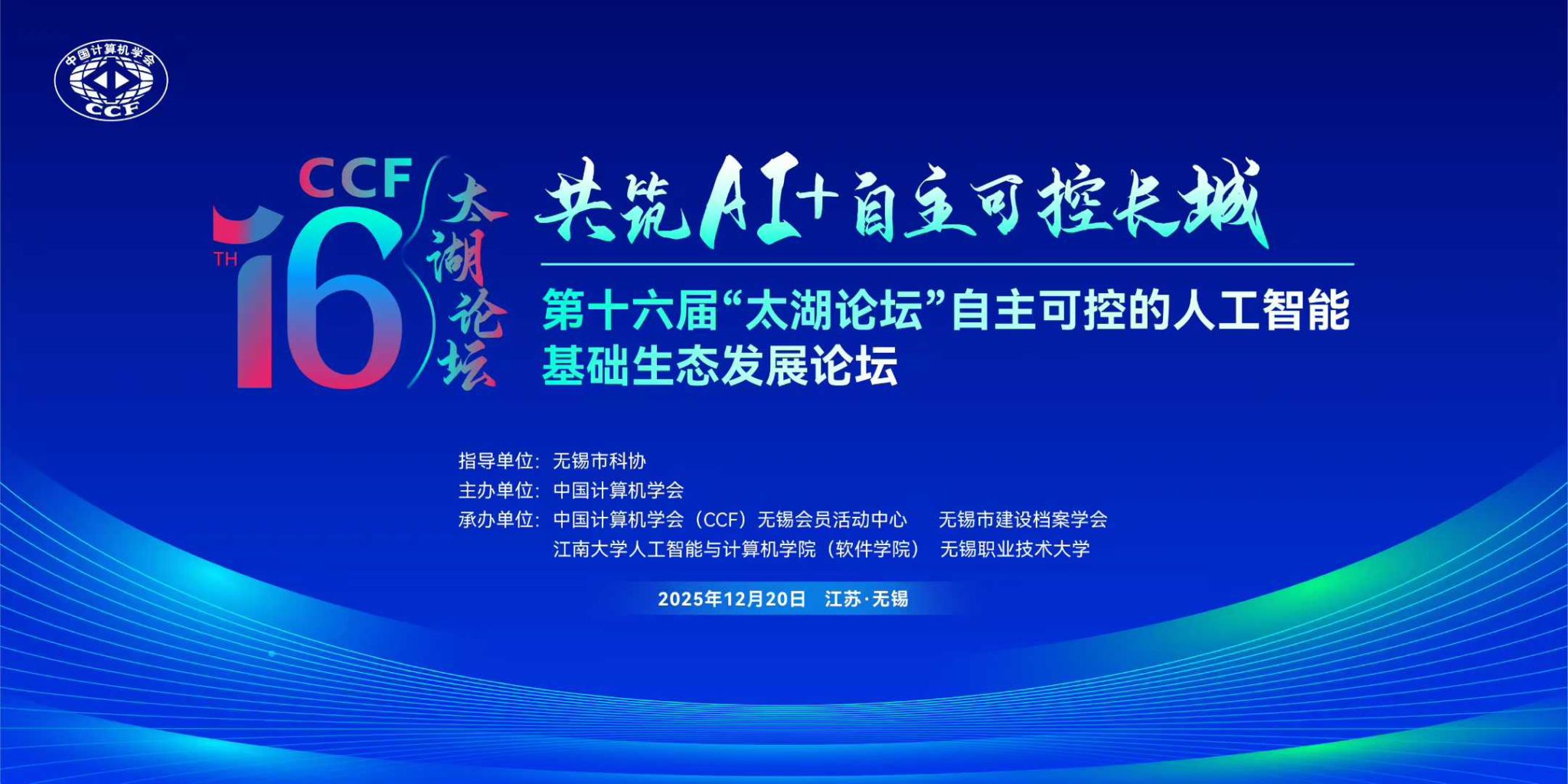 2025年12月20日,由中国计算机学会(CCF)主办,无锡职业技术大学联合江南大学人工智能与计算机学院(软件学院)、CCF无锡会员活动中心、无锡市建设档案学会共同承办的第十六届CCF太湖论坛——“自主可控人工智能基础生态发展论坛”在无锡长广溪宾馆太湖厅隆重举行。本次论坛以“生态+场景:共筑AI+自主可控长城”为主题,吸引了来自政府、高校、科研院所及产业界的200余名专家学者和业界代表齐聚一堂,共商我国人工智能基础生态的自主创新路径。