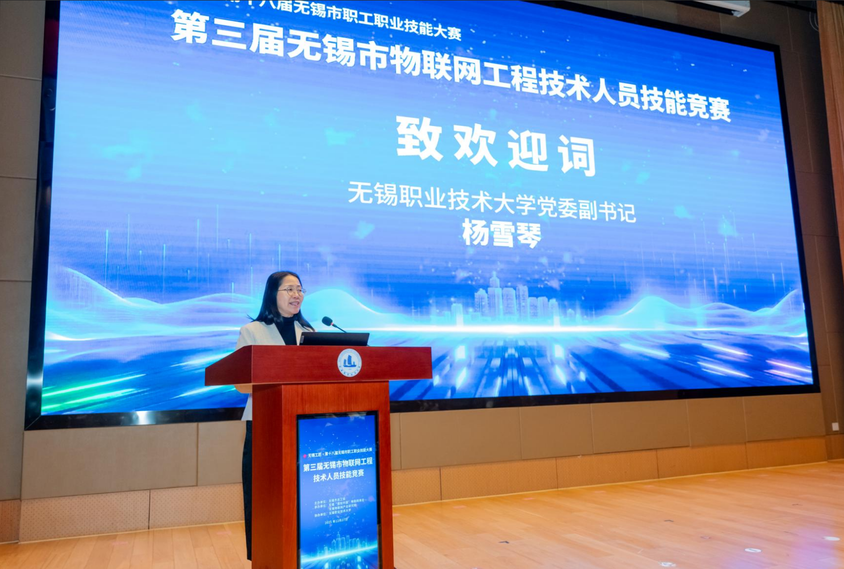 党委副书记杨雪琴代表学校致欢迎辞,对大赛的举办表示祝贺,并简要介绍了学校在物联网领域的人才培养与产教融合成果。她表示,学校将以协办此次竞赛为契机,持续深化“以赛促学、以赛促教”,为地方产业发展提供有力人才支撑。